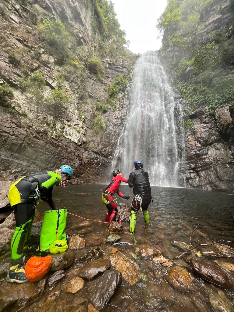 The team pulling ropes on the 6th pitch, right at the base of the main falls. You can see in the back of this photo the infamous Kanangra Slot, which is an alternative way down the main falls but best left for low flow.