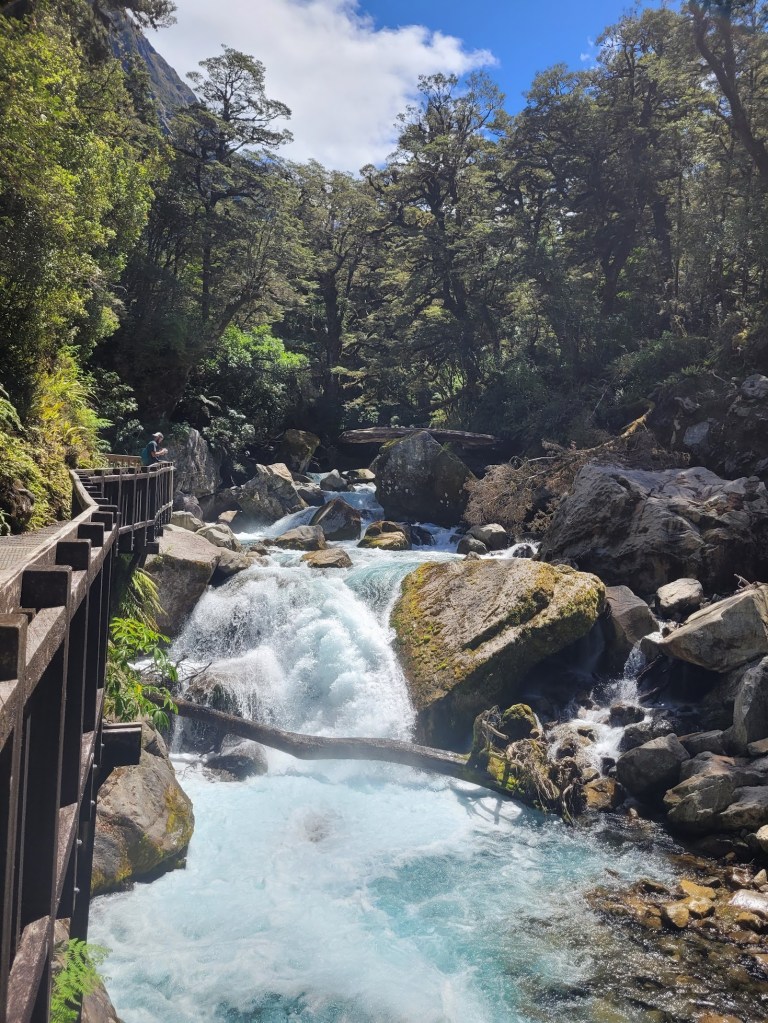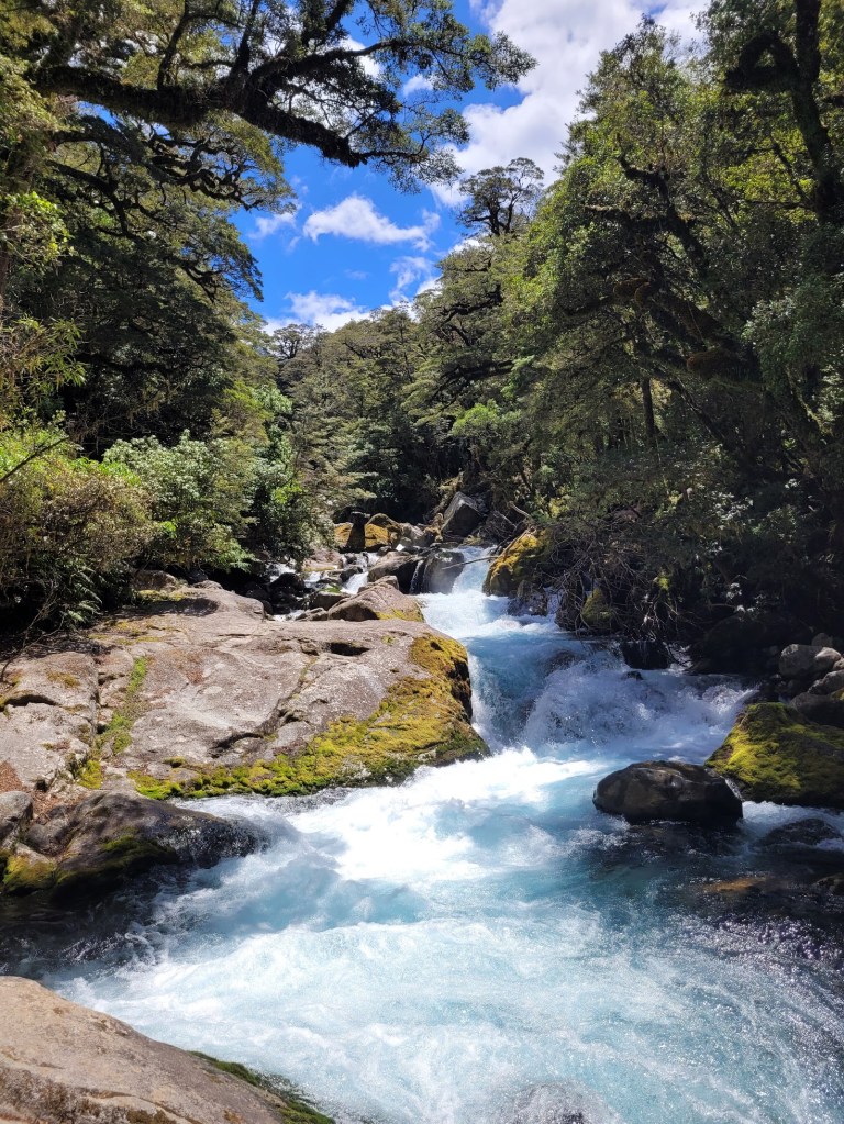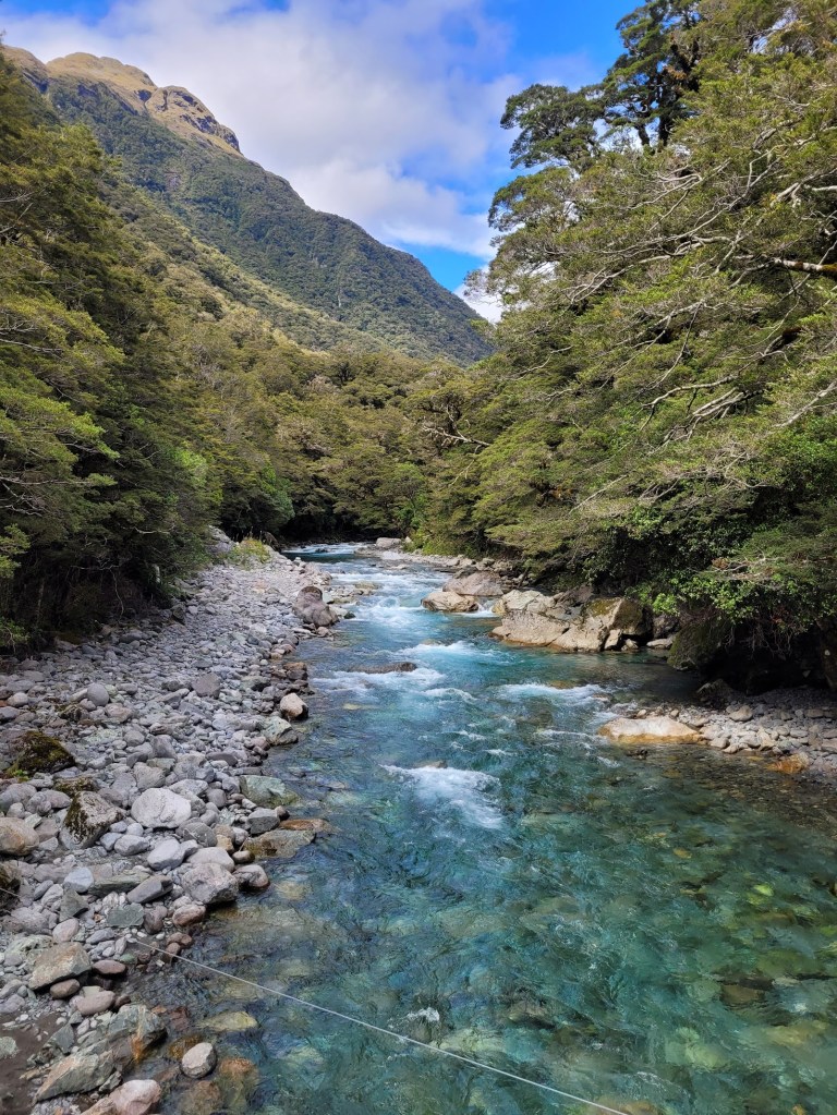 It’s a 6.3km return walk with 420m of elevation to reach Lake Marian. The track starts with a beautiful alpine river crossing. Just look at the colour of that water!