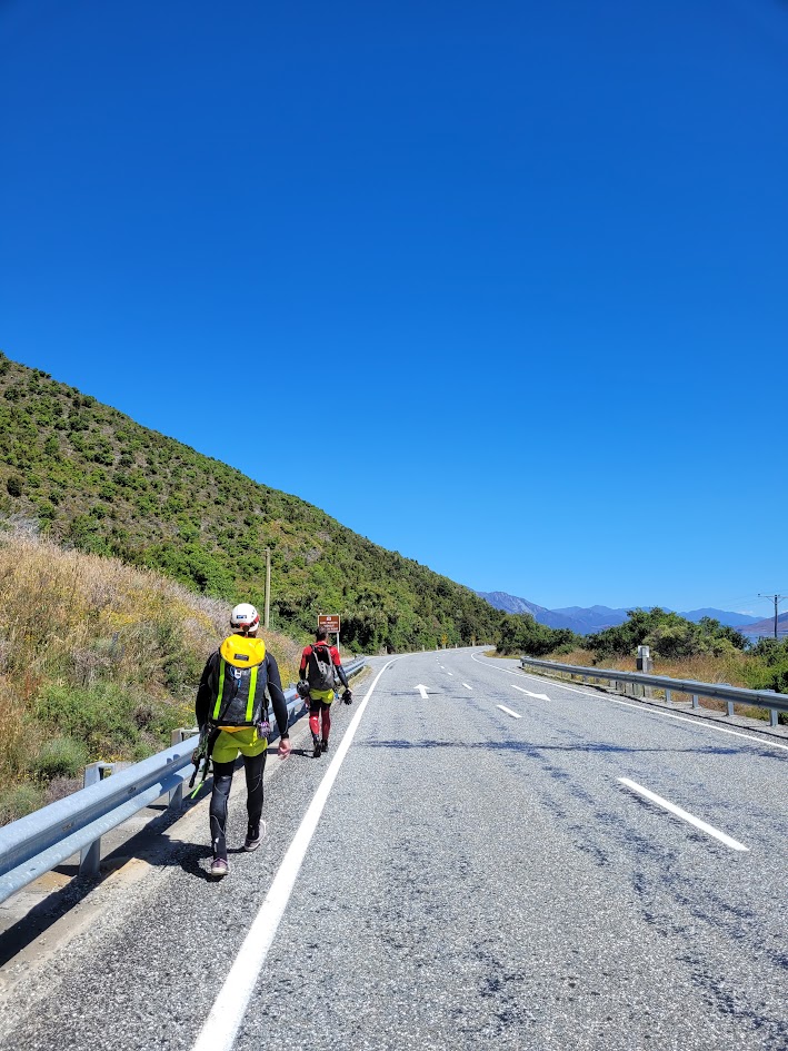 In the carpark for the canyon we bumped into the legendary Alain Rohr, who was getting ready to guide a small group through. We couldn’t help but speak with him and ask him to sign our canyoning books, after all, Alain had founded and carried out many first descent of canyons in New Zealand, including the ones we were doing in Haast Pass.